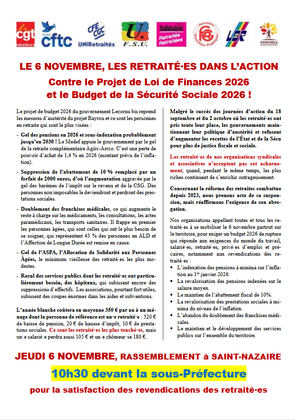 La section des retraité·es CGT Saint-Nazaire regroupe les camarades qui, bien qu’ayant quitté la vie active, continuent de s’impliquer dans les luttes sociales.